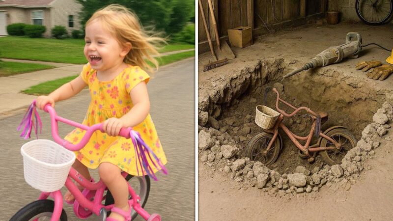 Linda Parker, Emily’s mother, stood on the front porch, beaming as the sound of Emily’s laughter resonated throughout the neighbourhood. The young girl’s yellow dress billowed in the breeze, while the white basket on her bicycle jostled on each uneven surface. “Do not venture too far, dear!” Linda shouted. “I shall not, Mother!” Emily retorted, exerting greater effort in her pedalling. However, a few minutes later, Emily did not reappear. The sun commenced its descent, and anxiety infiltrated Linda’s chest. She proceeded to the corner, anticipating her daughter would return, nevertheless the street was devoid of any presence. Alarm ensued. Neighbours participated in the urgent search, law enforcement was summoned, and the Parker family’s existence was irrevocably altered that night. The sole item discovered was a solitary pink ribbon from Emily’s bike streamer, resting in the grass adjacent to the park. There was no indication of Emily’s presence and no witnesses; she had inexplicably disappeared. For twelve years, Linda and her husband, Michael, endured anguish, clinging to diminishing hope. Emily’s room was preserved in its original state, with her stuffed animals meticulously arranged on the bed and her drawings affixed to the wall. Annually, on her birthday, Linda prepared a modest cake, murmuring her wishes into the darkness: “Please return, Emily.” The investigation became stagnant. Investigators pursued numerous leads that were fruitless. Ultimately, the Parkers relocated to a different area, unable to endure the incessant reminders of their daughter’s absence. The residence formerly occupied by Emily was sold, refurbished, and subsequently resold. No one could have anticipated that the solution to her disappearance had been concealed within those walls all along. In 2025, twelve years later, the old Parker house was undergoing renovation by a construction team employed by the new proprietors. The house had deteriorated, its basement moist and abandoned, prompting the renovators to dismantle a section of the concrete floor to install new plumbing. As the jackhammer penetrated the solid surface, the ground collapsed, exposing a void beneath. One of the employees, Dave Mitchell, down to remove debris. His torch beam halted on an intriguing sight—two small, corroded wheels, clearly discernible. A child’s pink bicycle was partially interred in the soil. The wicker basket was fractured and fragile, yet still whole. “Gentlemen…” “You must observe this,” Dave exclaimed, his voice quivering. The workers assembled around the pit, astonished.